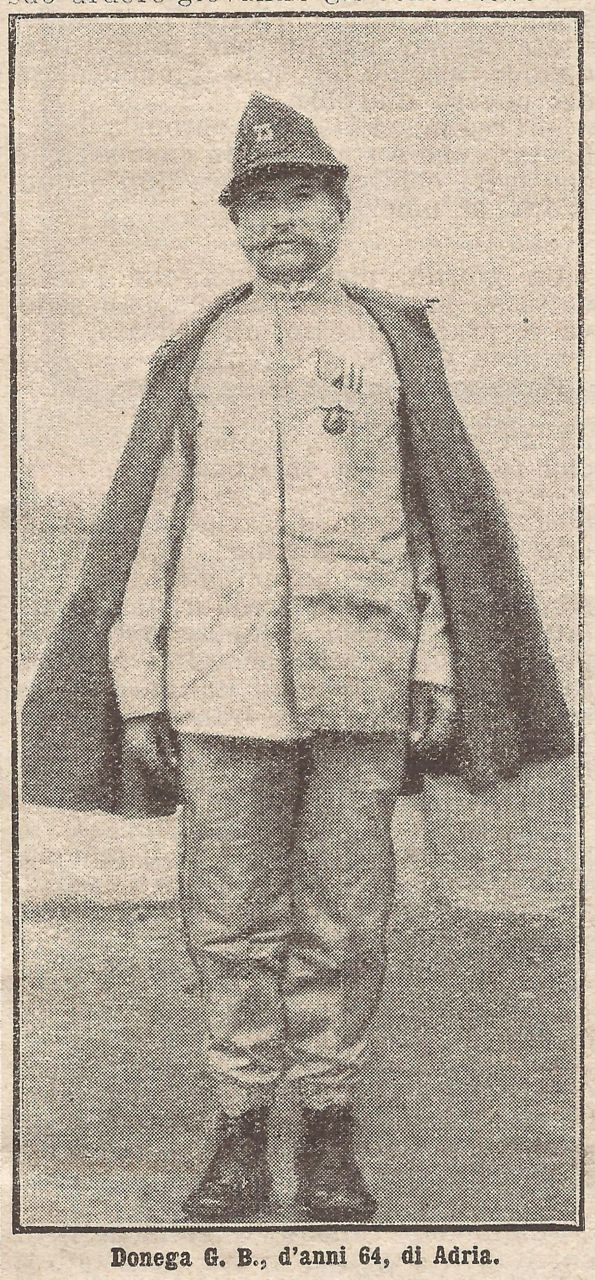 Partecipò giovanissimo alla campagna del 1866 nel Trentino, distinguendosi a Bezzecca. Nel 1870 trovavasi con le truppe italiane che entrarono in Roma. Ora si è arruolato volontario e la sua fibra robustissima ancora ed il suo ardore giovanile gli consentono infatti di sopportare le dure fatiche della guerra. Fra giorni raggiungerà sul fronte il reggimento al quale è stato assegnato.